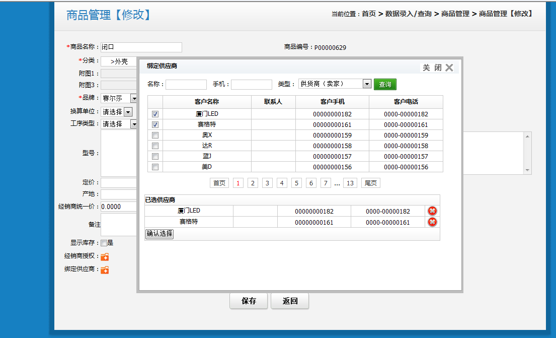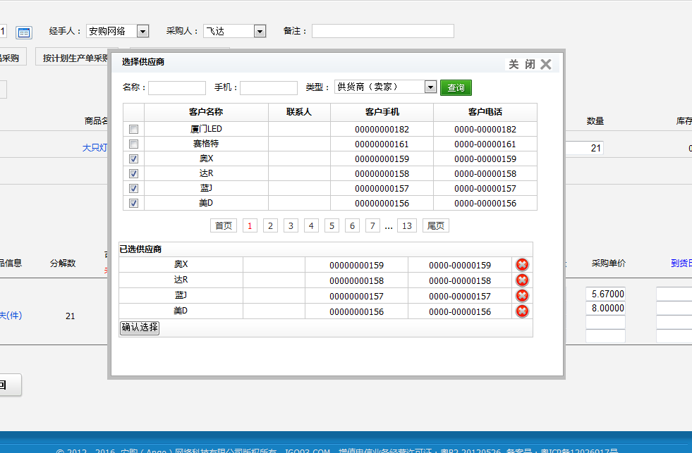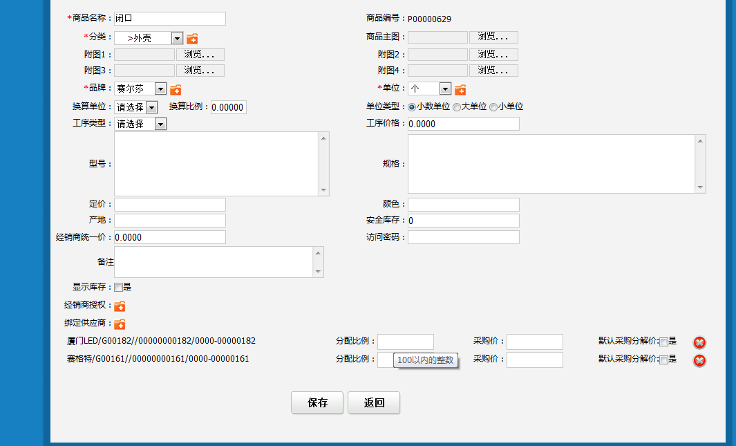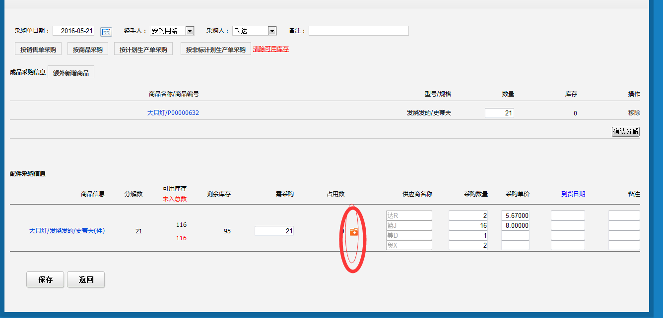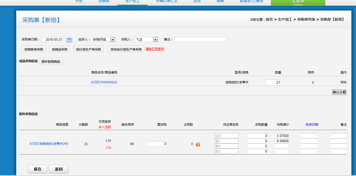 商品綁定多個供應商,主要用來生產(chǎn)加工,新增采購單或修改采購單: